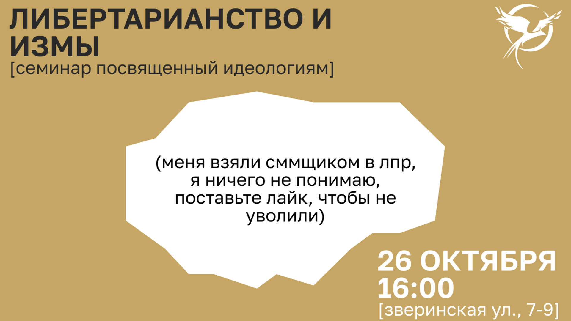 26 октября в 16:00 приглашаем вас на семинар, посвященный тому, что такое «идеология», зачем она нужна, чем отличается от «утопии» и какие они бывают. Разобраться в этих вопросах нам помогут мини-эссе от наших и дружественных нам авторов, которые будут выходить каждый день до мероприятия в этом канале. Ждите!